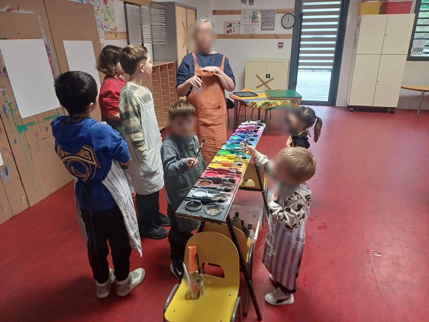La praticienne est toujours présente pour veiller au bon déroulement d’une séance. Elle propose de nouvelles feuilles, des escabeaux, des coussins, des activités sur la petite table pour les plus petits et veille au confort de chacun. Elle compose des mélanges à volonté, évite les coulures à l’aide de son couteau magique et s’emploie à réparer les petits dégâts. Toujours sans jugement car chacun est libre et peint pour soi. Il n’y a ni thème ni modèle